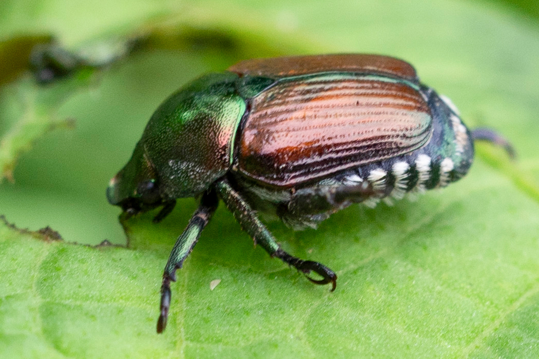 全長1cm前後のコガネムシ。褐色の前翅には縦筋が走っている。頭と胸はメタリックな緑色。頭と前胸の境目はV字型の逆三角形に見える。腹の縁には白い縞模様が見えている。